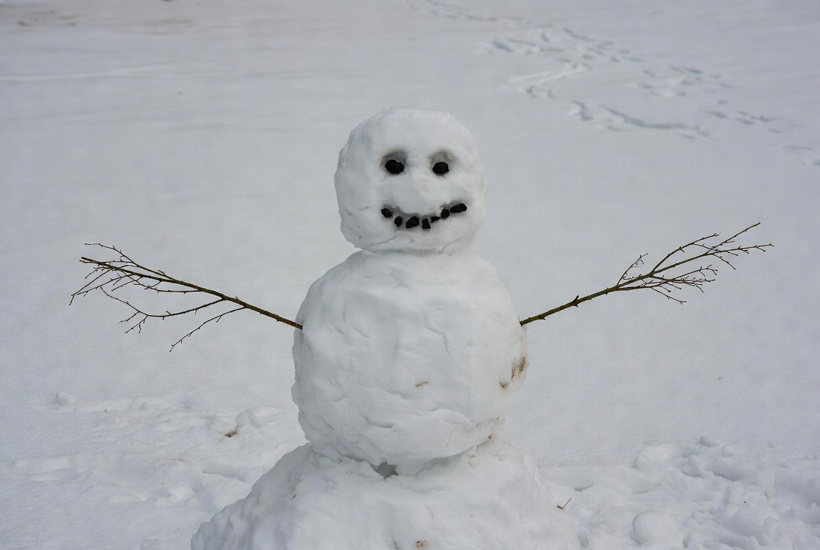 branches, carrot nose, coal eyes, cold weather, frosty, outdoor, smile, snow, snow figure, snow sculpture, snowy field, stick arms, white snow, winter, snowman