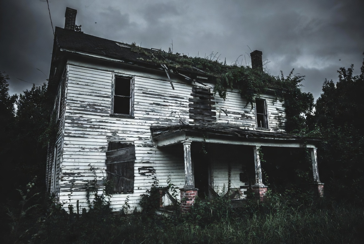 brick porch, broken windows, creepy house, dark clouds, decayed exterior, dilapidated building, eerie architecture, forest surroundings, grass, haunted house, mossy roof, old house, overgrown weeds, peeling paint, ruined home, sagging porch, spooky mansion, trees, vines, white house, abandoned house