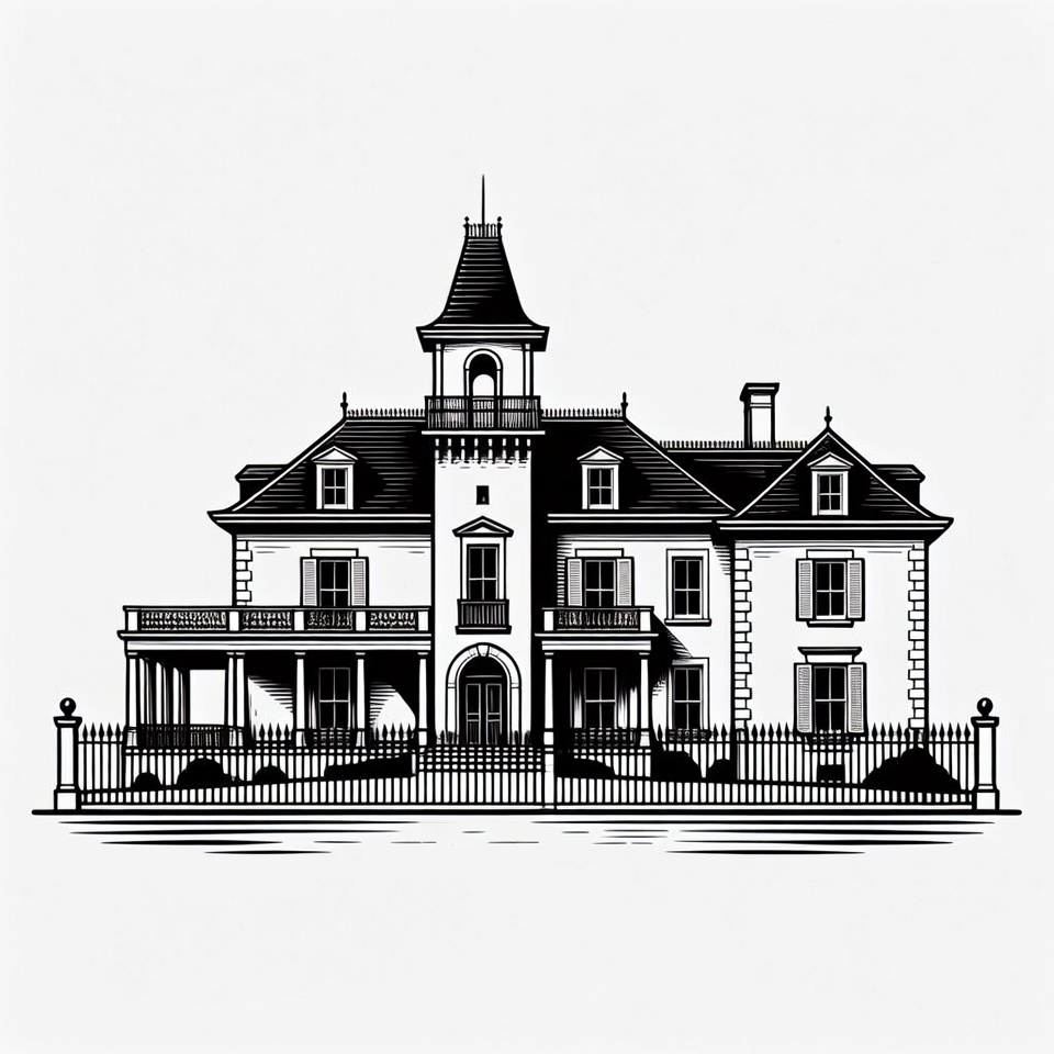architecture, balcony, black and white, clipart, drawing, engraving, estate, fence, historic home, house, illustration, isolated background, line art, mansion, porch, roof, tower, vector art, windows, Victorian mansion