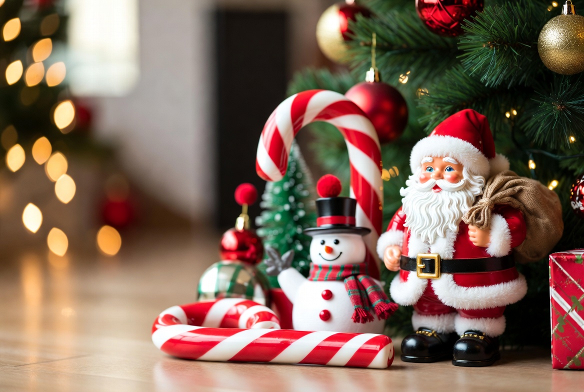 A cheerful Santa Claus figurine stands next to a snowman figure in front of a decorated Christmas tree adorned with red and gold ornaments. Large candy canes and wrapped gifts are placed on the wooden floor nearby. Festive lights create a warm bokeh background.
