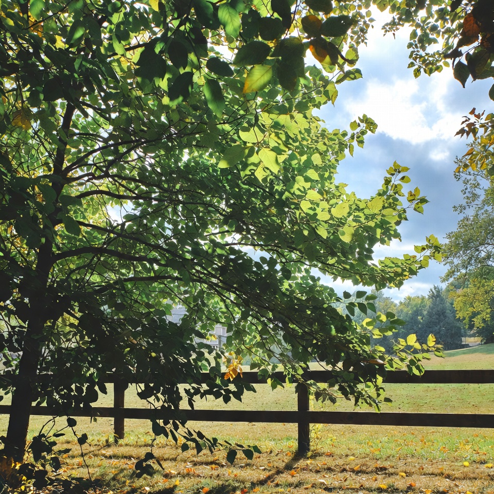 autumn leaves, branches, bushes, cloudy sky, fence, field, foliage, grass field, landscape, leaves, nature, outdoors, park, sky, sunlight, tree branches, trees, wooden fence, yard, green tree