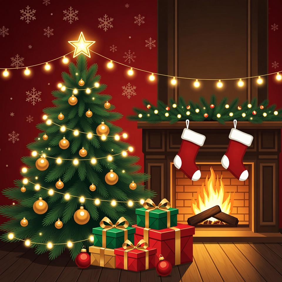 A vibrant illustration features a decorated Christmas tree with golden ornaments and lights next to a cozy fireplace with burning logs. Red stockings hang from the mantel above colorful wrapped gift boxes in red and green. Snowflakes and string lights enhance the festive holiday scene on a wooden floor.