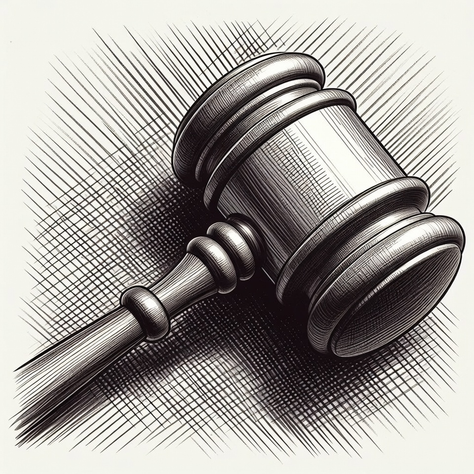 A detailed black and white line drawing of a wooden gavel angled on a surface. The gavel features a smooth hammer head with curved edges and a slender handle banded with rings. Fine cross-hatching provides shading and depth to the illustration.