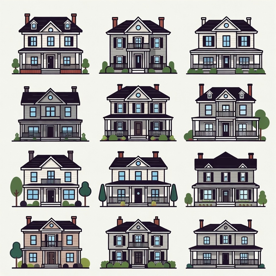 architecture vectors, beige houses, black houses, chimneys, clipart, decorative elements, front views, gabled roofs, gray houses, home icons, house illustrations, isolated background, line art, minimalist design, outline houses, porches, red accents, residential buildings, shrubs, simple drawings, trees, two-story houses, vector houses, white houses, windows, houses