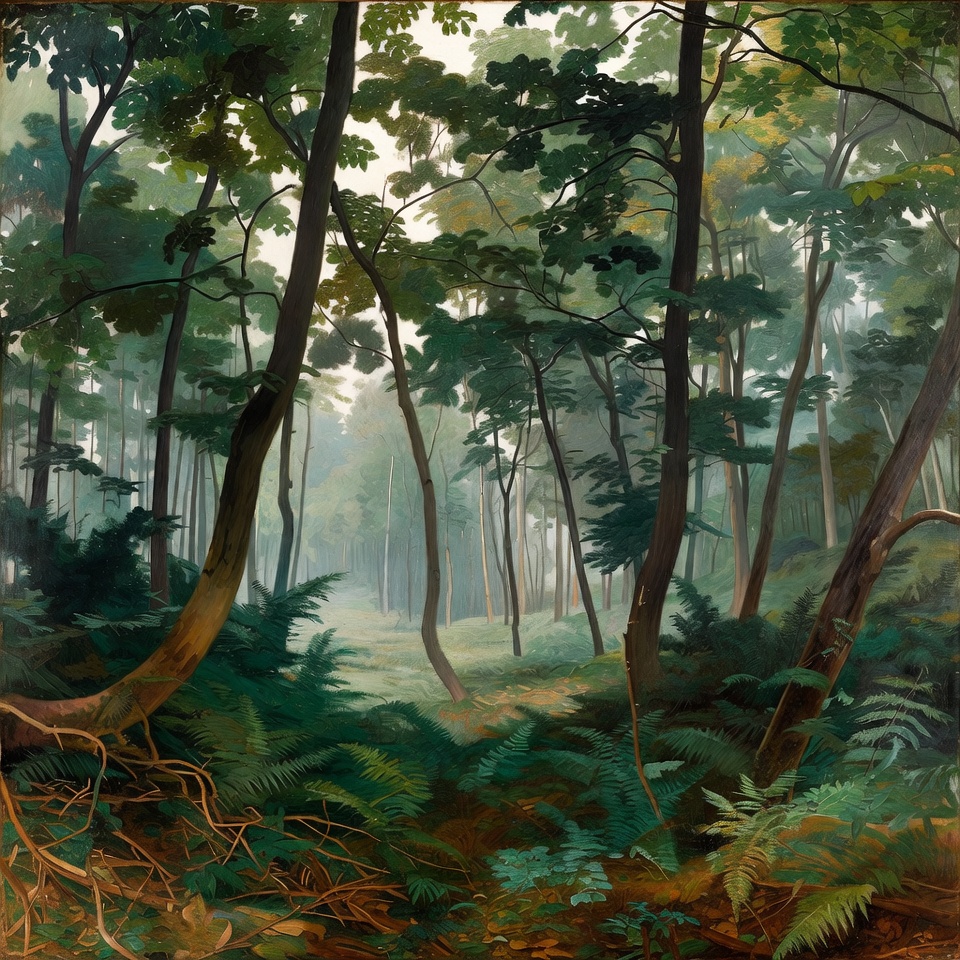 art, canopy, dense trees, ferns, foggy forest, foliage, forest path, green forest, green leaves, landscape, lush forest, mist, natural scenery, nature, painting, path, sunlight, tree trunks, trees, undergrowth, verdant woods, woodland, forest