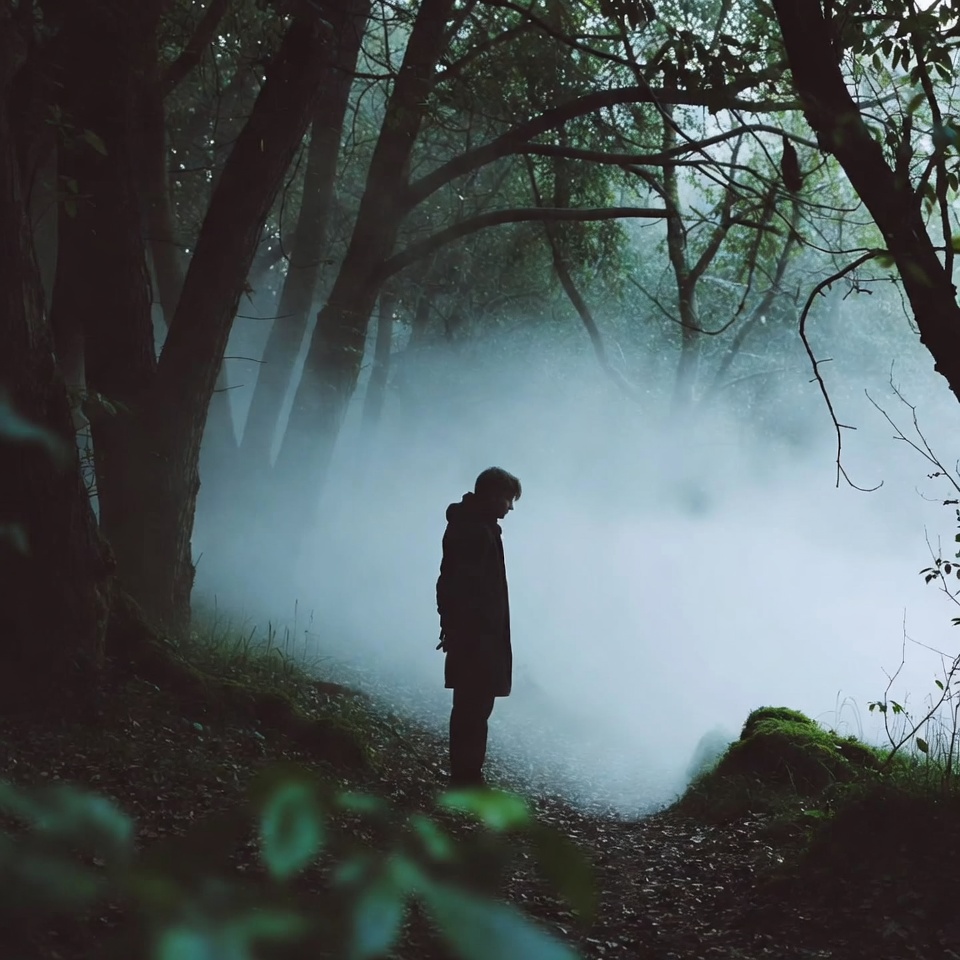 A silhouette of a man in a hooded coat stands alone on a forest path surrounded by tall trees. Thick fog envelops the scene, creating a misty atmosphere with mossy ground and overhanging branches. He faces away from the viewer, gazing into the dense woods.