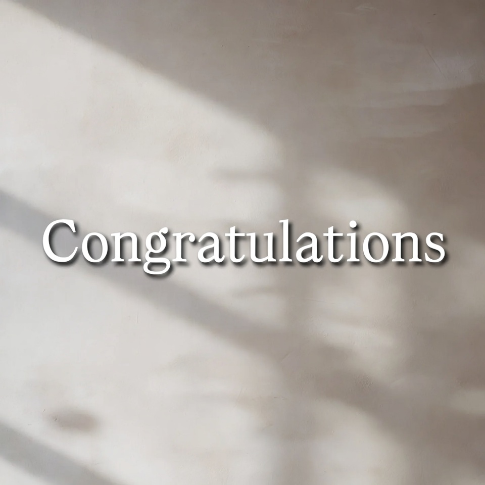 Large elegant 'Congratulations' text in white letters centered on a blurred beige background. Soft shadows and light rays create a subtle gradient effect behind the text. The design features a clean, minimalist style suitable for celebrations.