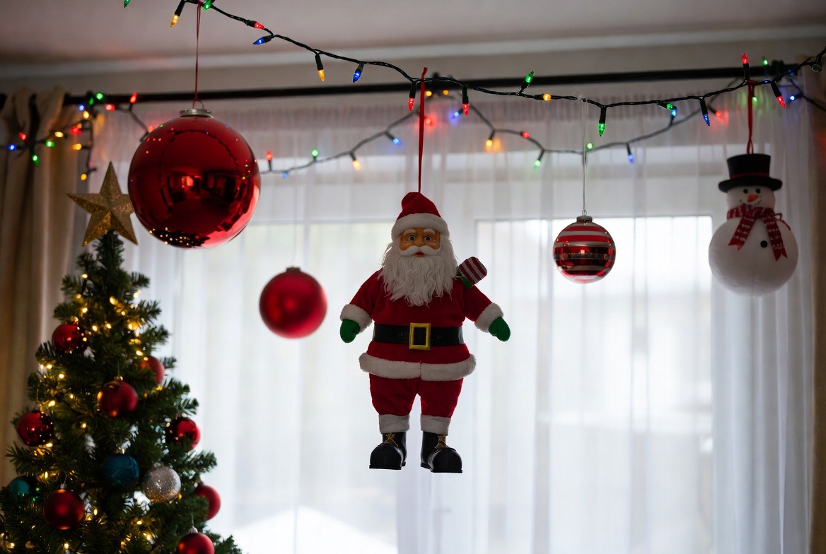 A plush Santa Claus figure hangs in front of a Christmas tree adorned with red and striped ornaments. Colorful string lights and large shiny baubles like a red ball and gold star dangle from the ceiling above a curtained window. Snowman and top hat decorations add to the festive holiday display.