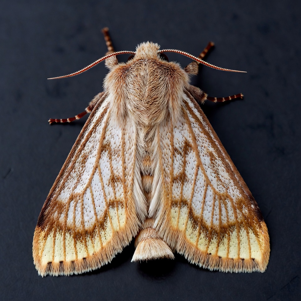 antennae, arthropod, black background, brown moth, detailed wings, furry body, insect, lepidoptera, macro photography, nature, white moth, wildlife, wings spread, yellow wings, moth