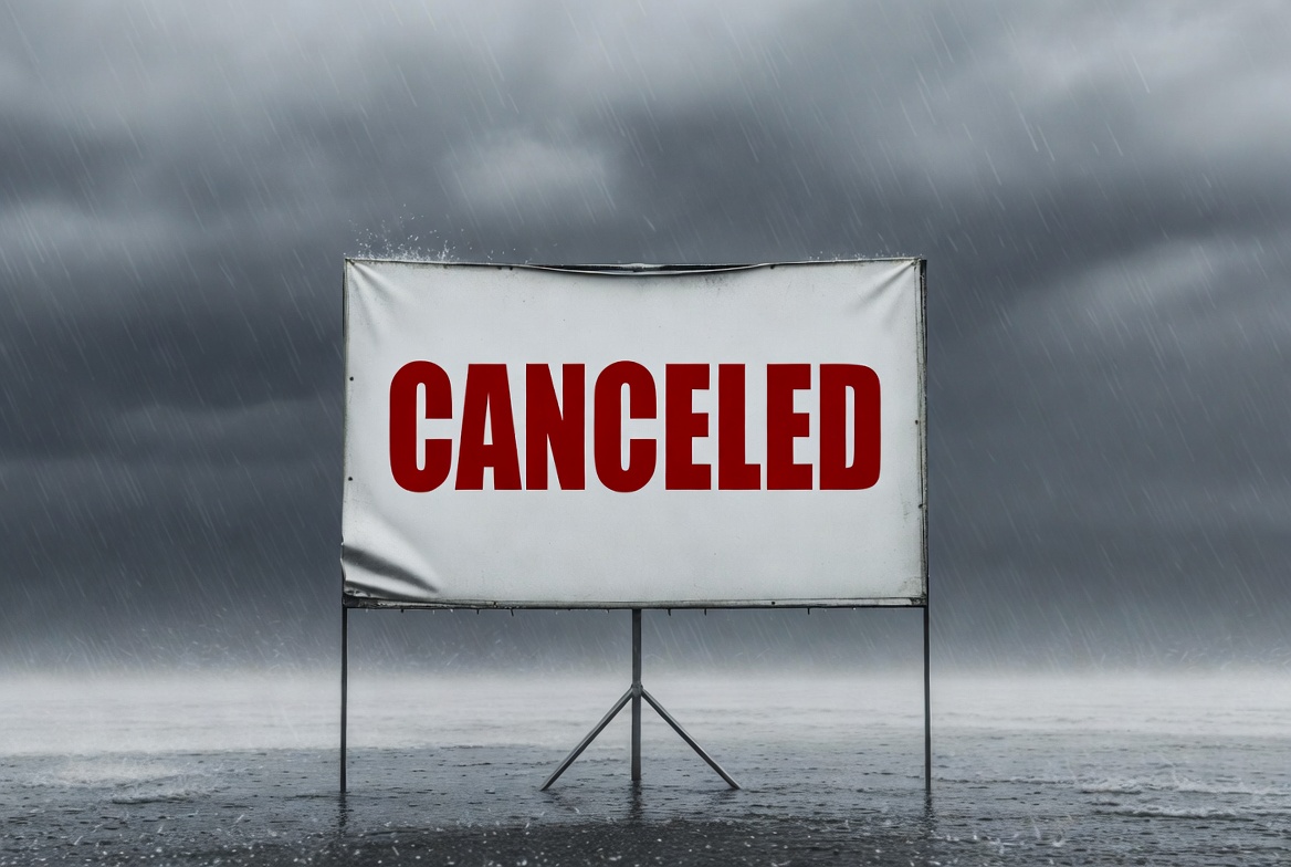 A large white banner with bold red 'CANCELED' text stands on a tripod against a stormy gray sky with heavy rain. Water splashes around the base of the sign on a wet, foggy ground. The dramatic weather emphasizes the cancellation message.
