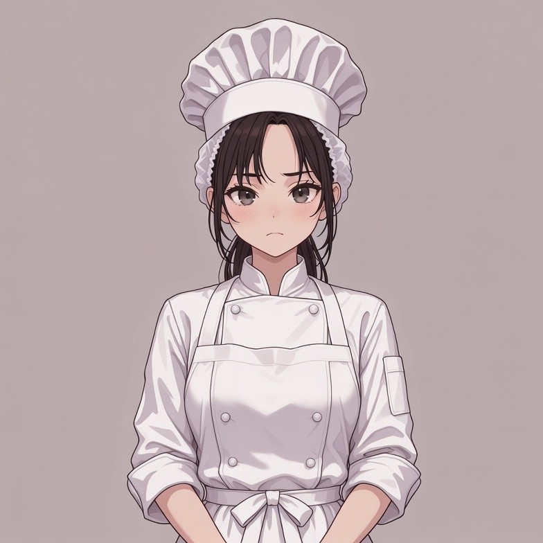 Asian, apron, blush, chef, chef hat, chef uniform, cute, dark hair, female chef, illustration, isolated background, kitchen uniform, manga style, ponytail, standing pose, white uniform, woman, anime