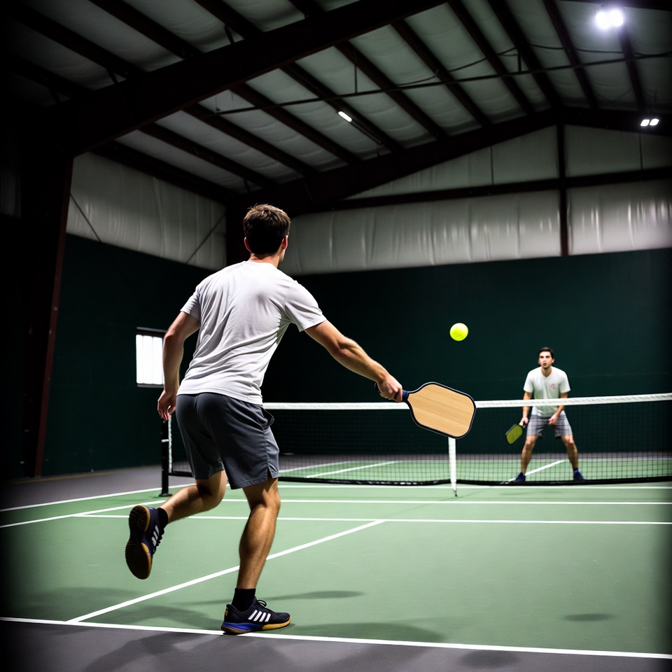 Two men playing pickleball indoors