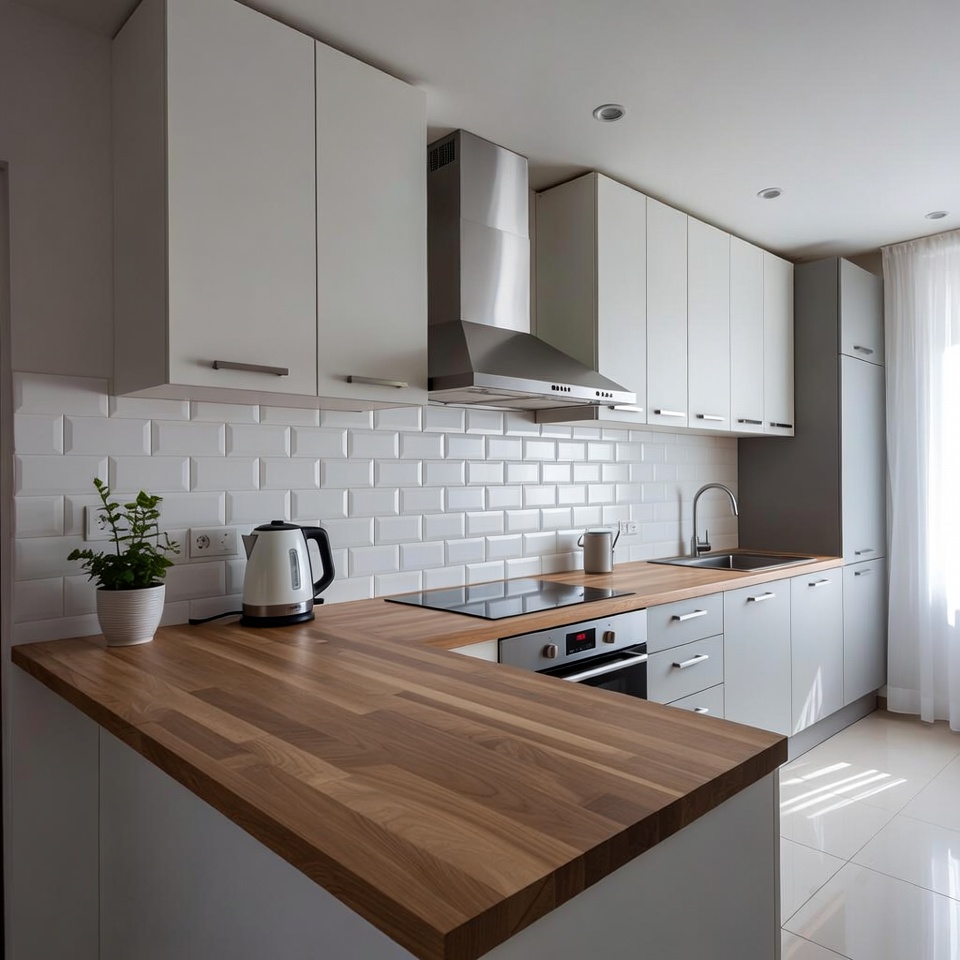 appliances, backsplash, cabinetry, clean kitchen, contemporary kitchen, countertop, electric kettle, grey cabinets, home interior, induction cooktop, kitchen design, minimalist kitchen, modern kitchen, oven, potted plant, range hood, recessed lighting, sink, stainless steel, subway tiles, white cabinets, window curtains, wooden countertop, kitchen