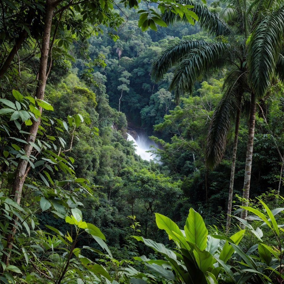 broad leaves, cascade, dense forest, foliage, forest landscape, green trees, greenery, jungle, jungle waterfall, lush vegetation, natural scenery, nature, palm trees, rainforest, tall trees, tropical forest, tropical plants, valley, waterfall view, waterfall