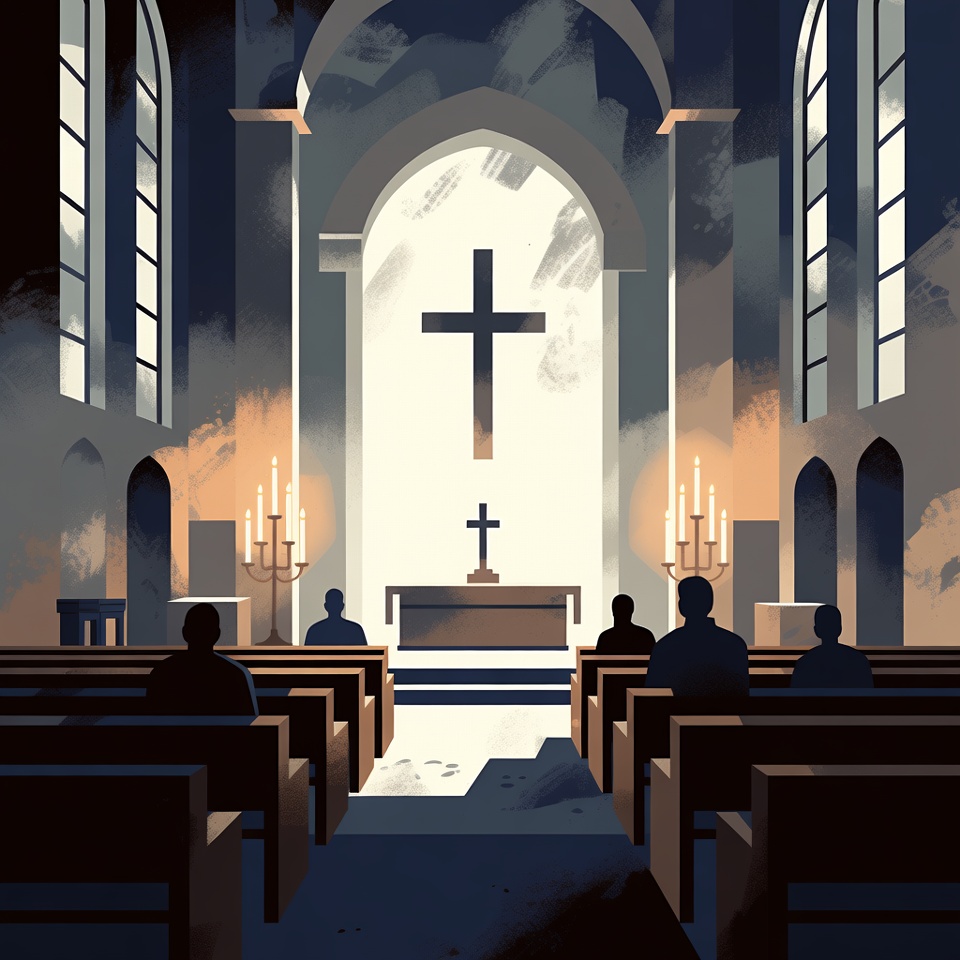 An illustration of a gothic church interior with tall arched windows and candlelight. Silhouetted figures sit in pews facing a large illuminated cross above the altar. A priest stands at the pulpit with additional silhouettes nearby.