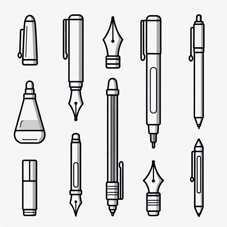 A collection of various writing instruments and a beaker depicted in minimalist black line art on a white background. The set includes fountain pens, ballpoint pens, dip pens with nibs, mechanical pencils, and a conical flask. All items are outlined with clean, thin strokes and arranged in a grid-like pattern.