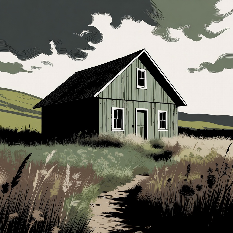 countryside, dark clouds, digital art, dirt path, field, grass, green house, hills, home, house, illustration, isolated, landscape, nature, outdoors, path, rolling hills, rural, scenery, sky, stormy clouds, tall grass, weeds, wooden cabin, cabin