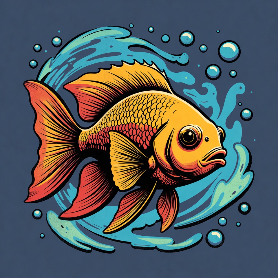 A vibrant orange goldfish swims in a circular motion surrounded by blue water splashes and bubbles. The fish features detailed scales, large expressive eyes, and flowing fins in shades of yellow, orange, and red. The artwork is rendered in a bold illustrative style on a dark blue background.