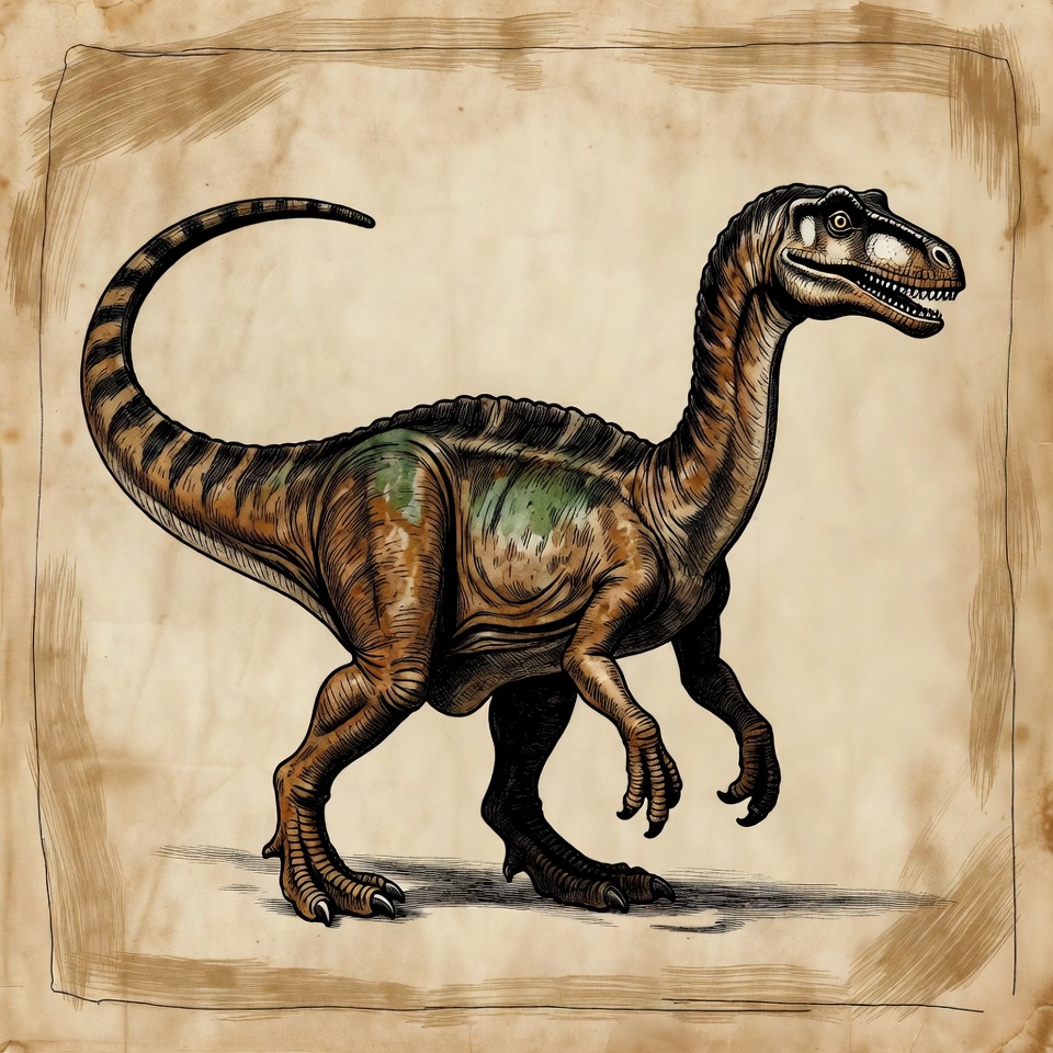 Jurassic, brown dinosaur, clipart style, dinosaur, fierce dinosaur, green dinosaur, illustration, ink drawing, isolated background, long tail, parchment paper, prehistoric animal, raptor, roaring dinosaur, sharp claws, striped dinosaur, textured background, walking pose, watercolor, Velociraptor