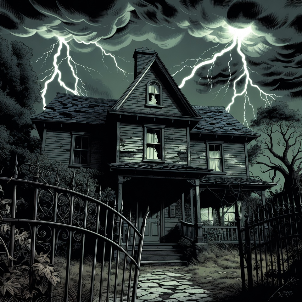 A dark, gothic haunted house stands behind an iron gate on a stormy night. Multiple lightning bolts strike across the turbulent sky, illuminating the dilapidated structure with broken windows and overgrown surroundings. A stone path leads to the front porch amid twisted trees.