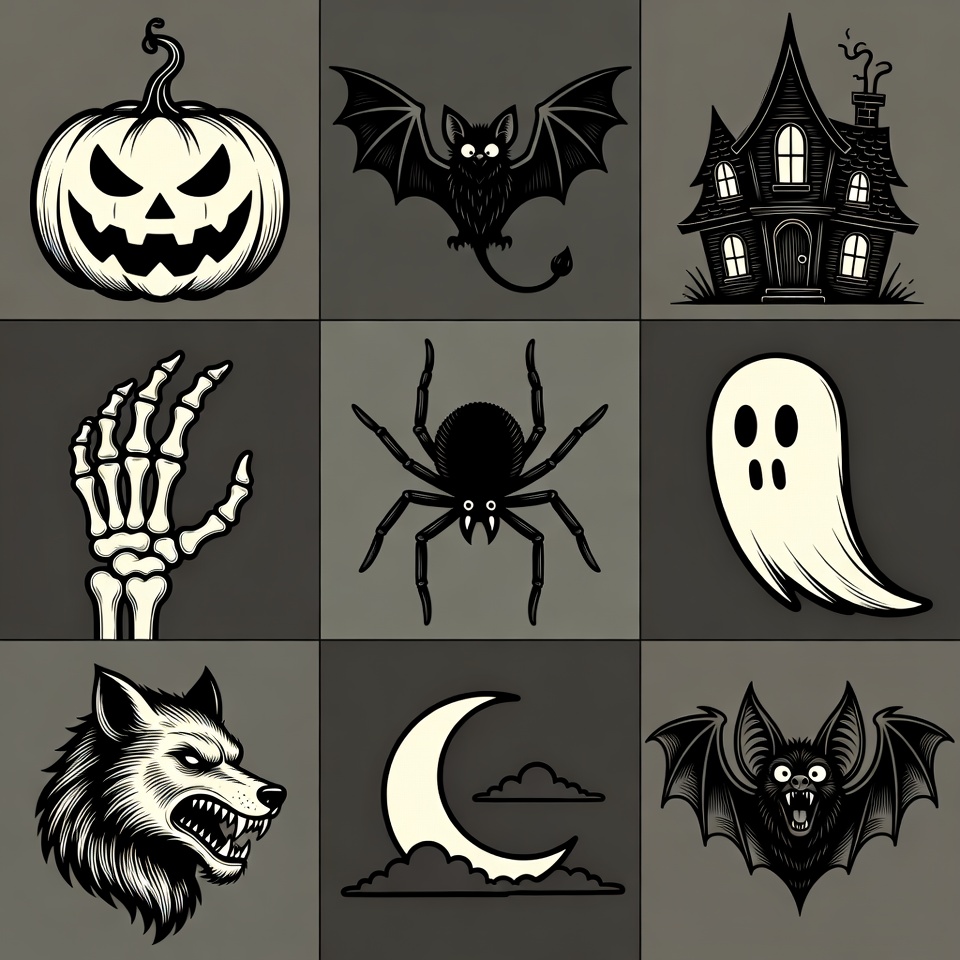 October, bat, black white, clipart, clouds, crescent moon, ghost, grid, haunted house, holiday, icons, illustration, isolated background, jack-o-lantern, line art, pumpkin, skeleton hand, spider, spooky, wolf head, Halloween