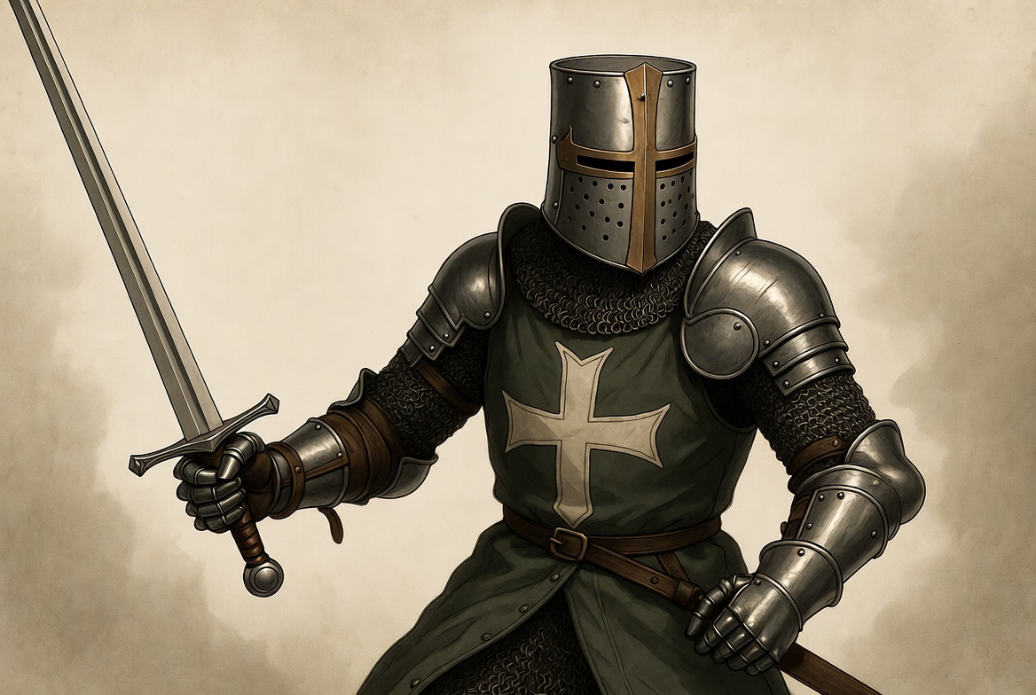 armed knight, armor, chainmail, crusader, fantasy knight, gauntlets, green surcoat, helmet, historical knight, illustration, isolated background, male, medieval knight, plate armor, sword, warrior, white cross, knight