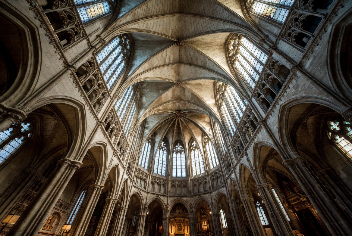 arches, church, european cathedral, golden light, gothic architecture, historic building, interior, nave, ornate ceiling, pointed arches, religious architecture, ribbed vaults, stained glass, stone, sunlight, tall windows, vaulted ceiling, windows, cathedral