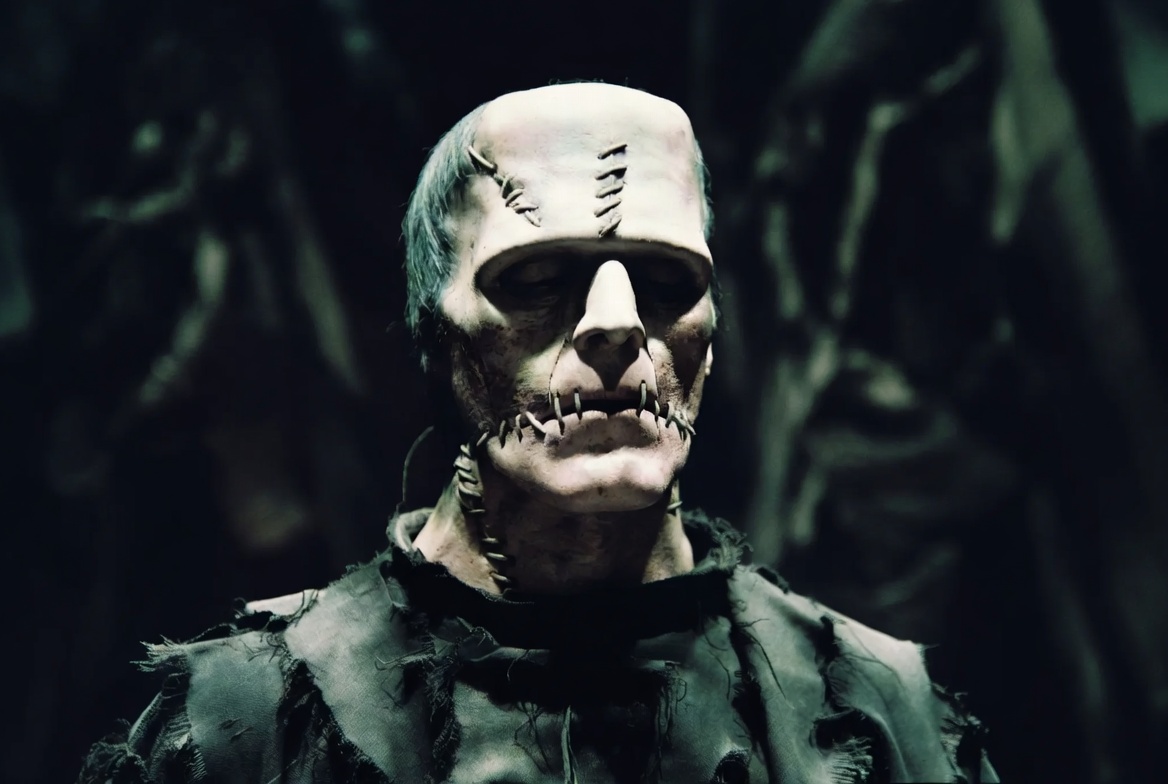 A Frankenstein monster with pale stitched skin and green-tinted face stares forward intensely. He wears ragged dark clothing with frayed edges. The image features a dark background enhancing the eerie stitched visage.