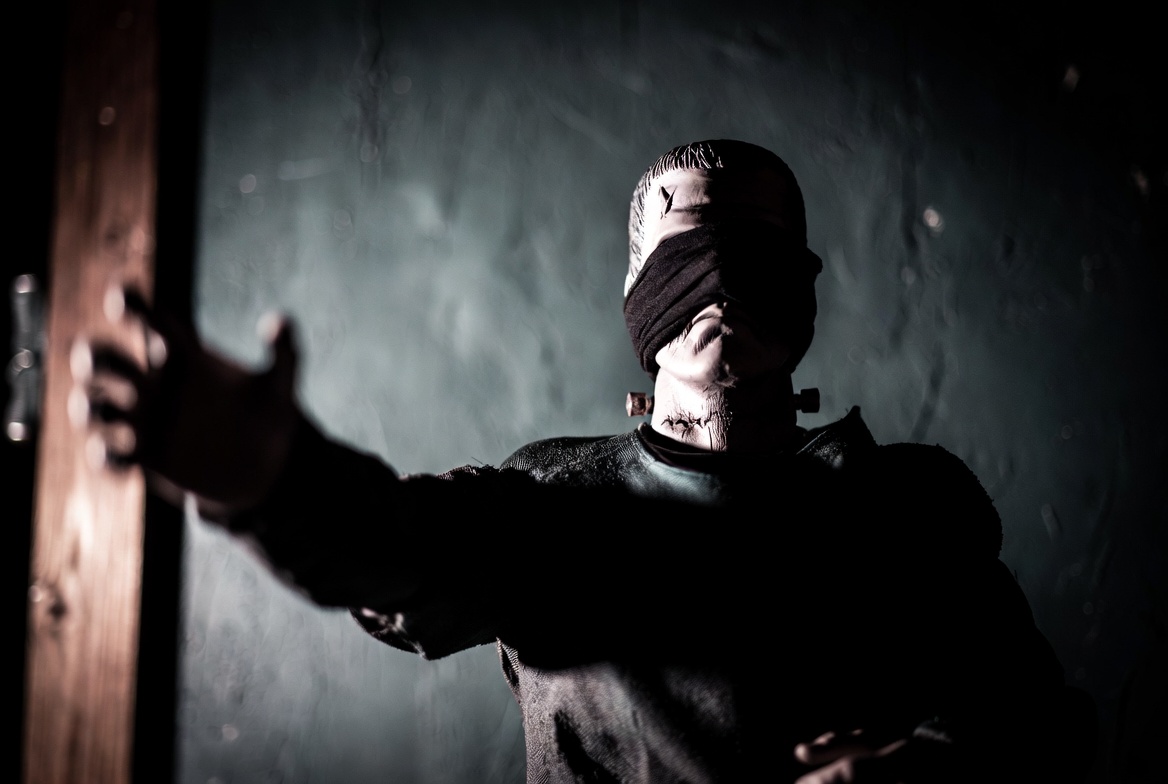 Frankenstein, White, black blindfold, blindfold, creepy, dark clothing, dark room, green walls, horror, male, man, neck tattoos, open door, outstretched arms, reaching out, shadows, stitches, wooden door, blindfolded man