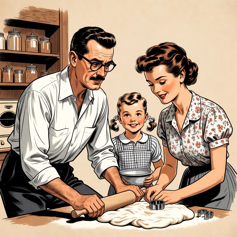apron, cookie cutters, cookies, daughter, dough, father, girl, glasses, illustration, jars, kitchen, mother, mustache, pigtails, rolling pin, shelves, vintage style, white ethnicity, family baking
