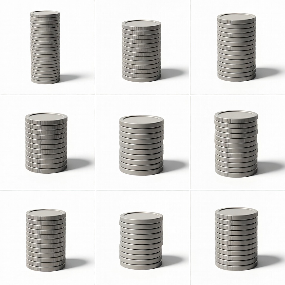 A 3x3 grid displays stacks of gray coins in varying heights on white backgrounds. The stacks range from single coins to tall piles, each with subtle shadows for depth. The arrangement showcases different quantities of identical round coins.