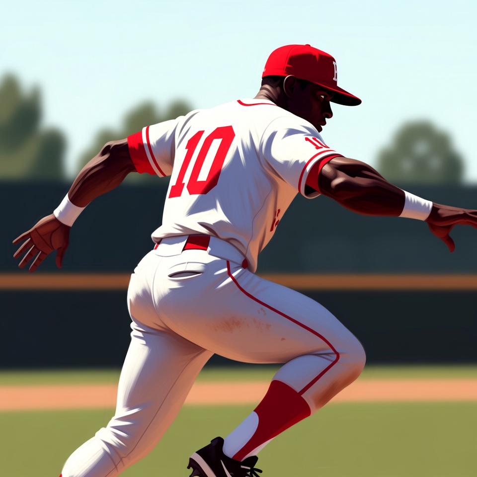 An African-American man in a white baseball uniform with red trim and number 10 sprints around the bases on a green field. He wears a red cap and black cleats, captured in dynamic motion with blurred stadium background. His muscular build and focused posture highlight the action.