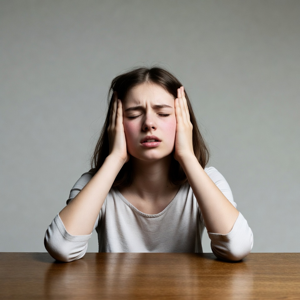 A young woman with brown hair sits at a wooden table, pressing both hands against her temples. She wears a loose white t-shirt and displays a pained expression with furrowed brows, flushed cheeks, and slightly open mouth. The background is plain gray.