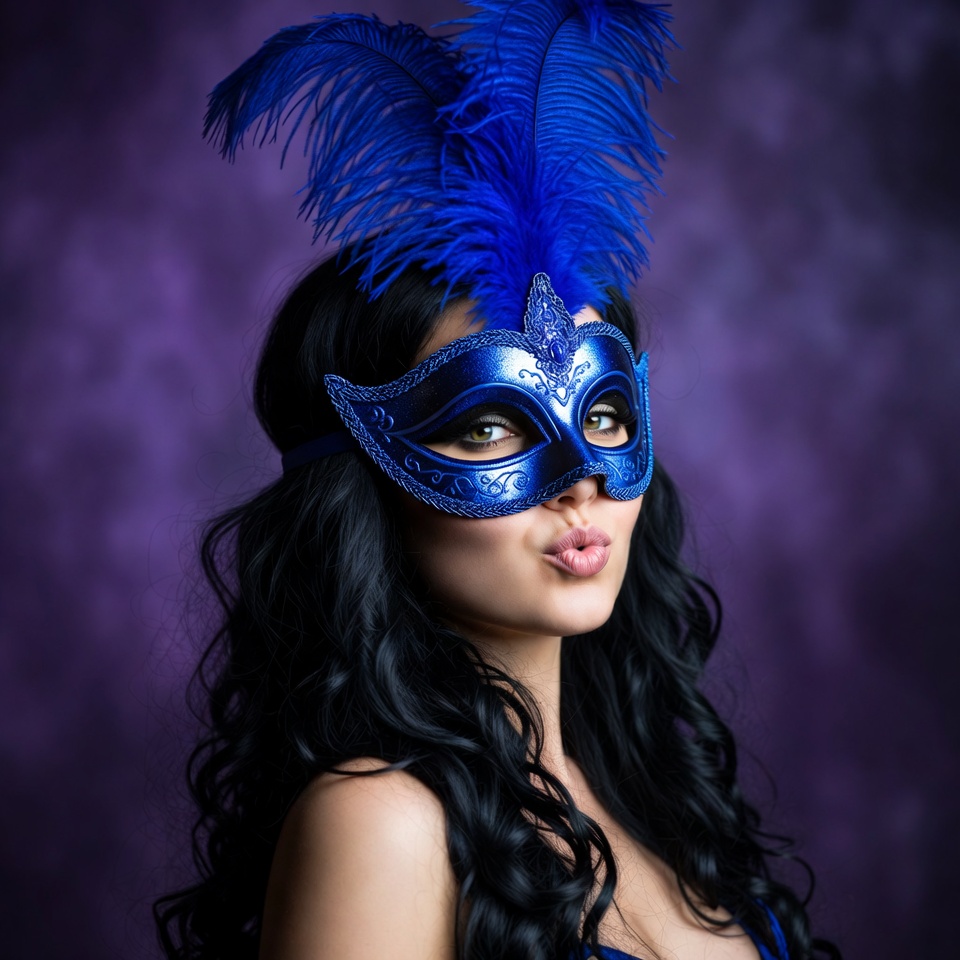A woman with long black wavy hair wears an ornate blue masquerade mask adorned with blue feathers. She puckers her lips in a kiss pose against a purple background. Her shoulders are bare, highlighting the elegant mask and feathers.