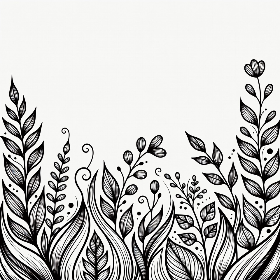 artistic plants, black white, botanical, buds, clipart, decorative border, doodle, elegant flowers, floral design, flowers, foliage, greenery, hand drawn, ink illustration, isolated background, leaf pattern, leaves, line art, monochrome, petals, plants, stems, swirl design, vector art, vine illustration, floral border