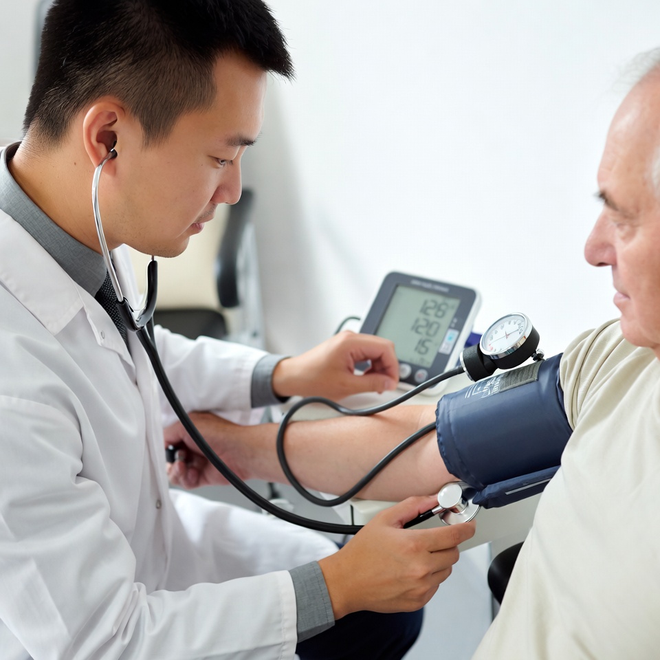 Asian, White, arm cuff, blood pressure, checkup, clinic, elderly man, health check, healthcare, hospital, male, medical exam, monitor, office, patient, physician, senior citizen, sitting, sphygmomanometer, stethoscope, white coat, young doctor, doctor
