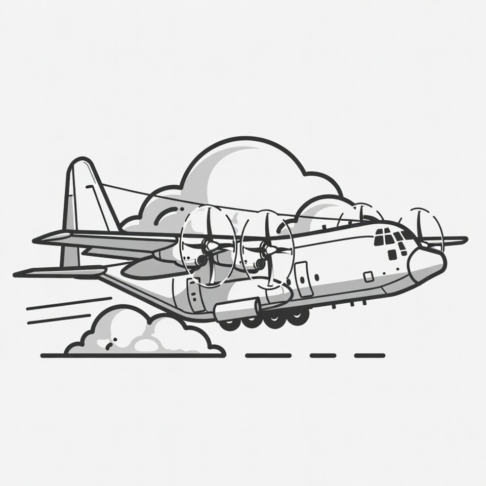 aircraft, airplane, aviation, cargo plane, clipart, clouds, flying, illustration, isolated background, line art, military plane, monochrome, propellers, sketch, transport aircraft, turboprop, vector art, C-130 Hercules