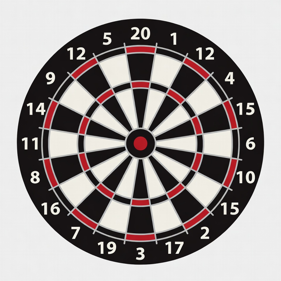 A classic black and white dartboard features red and green double and triple segments. Numbers from 1 to 20 are arranged around the circular board. The bullseye is centered in red on a gray background.