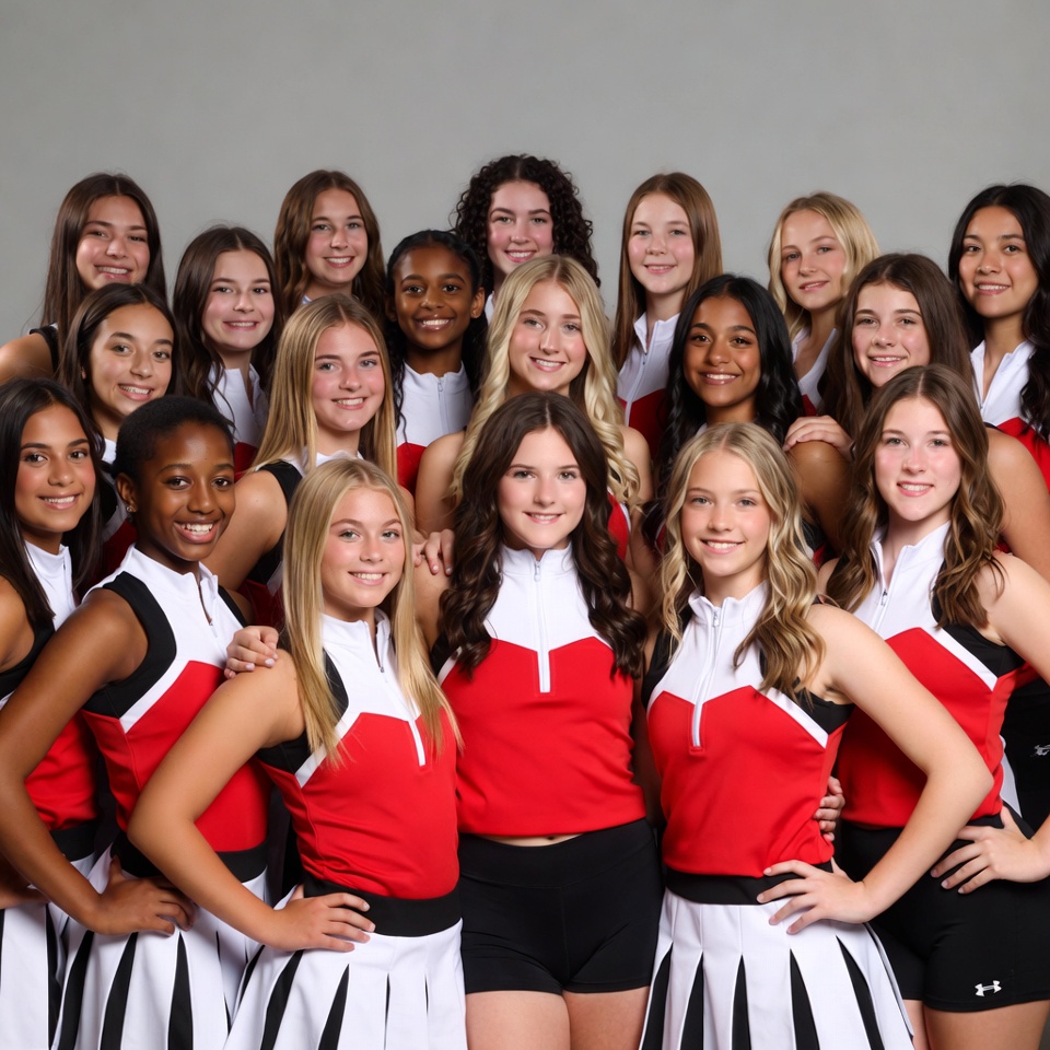 African-American, Asian, Latino, White, arms around, black shorts, cheer squad, cheer uniform, cheerleaders, diverse girls, female, girls, gray background, group photo, group shot, high school cheerleaders, ponytail, red crop top, smiling girls, sport uniform, standing together, team pose, teenage girls, white skirt, young women, cheerleading team