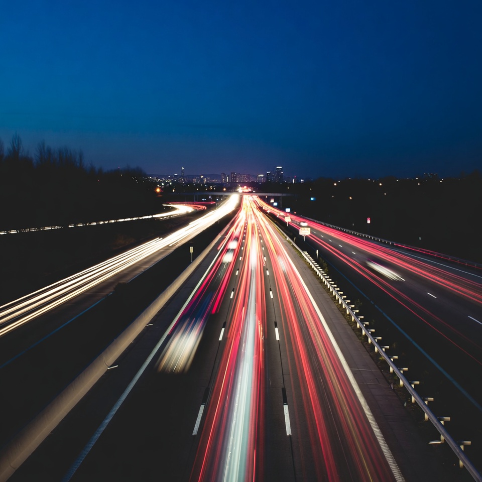 asphalt, blue sky, cars, city lights, dark sky, driving, evening, freeway, horizon, lanes, light trails, long exposure, motion blur, night, red lights, road, silhouettes, speed, street lights, traffic, transportation, trees, urban, vehicles, white lights, highway
