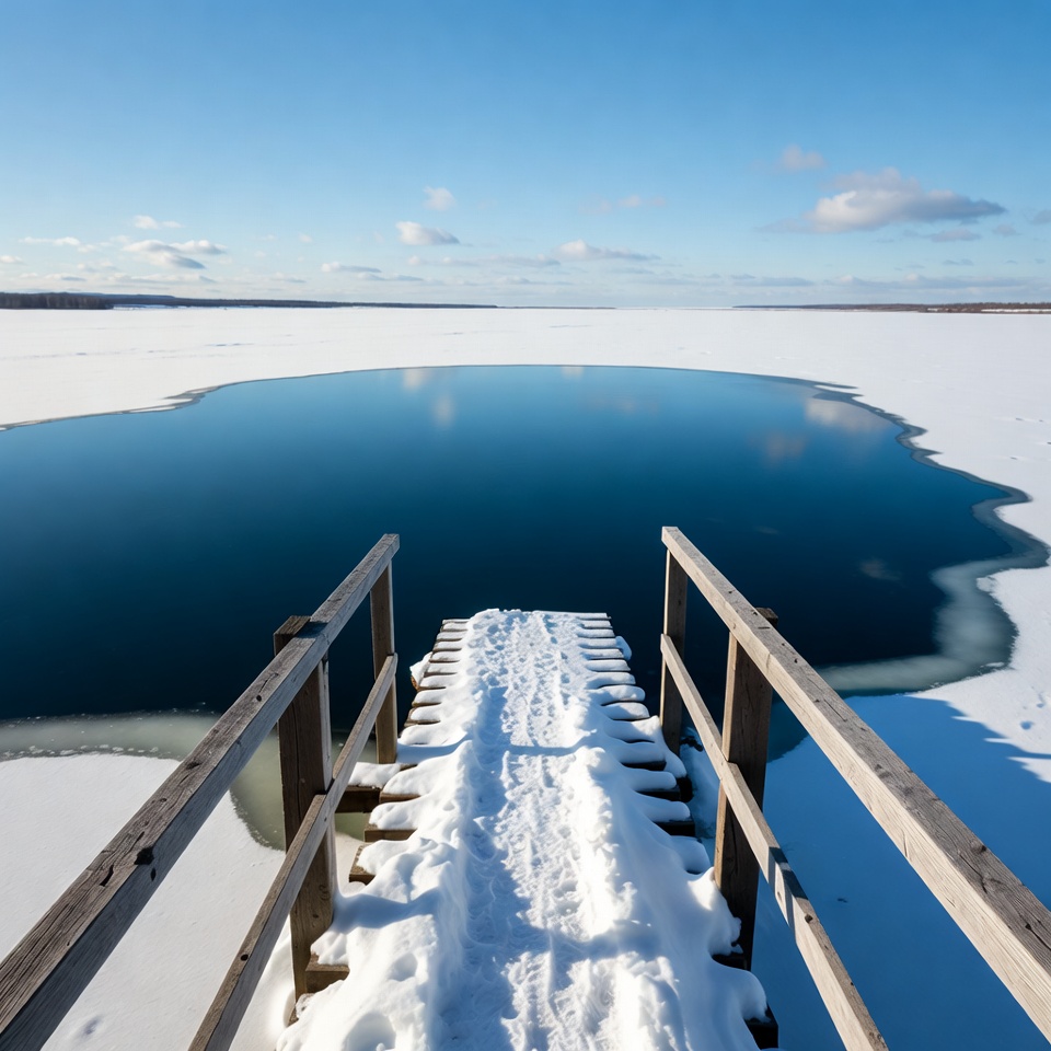 blue sky, clouds, cold weather, footprints, frozen lake, horizon, ice, landscape, nature, outdoors, railing, snow, water edge, winter, wooden pier