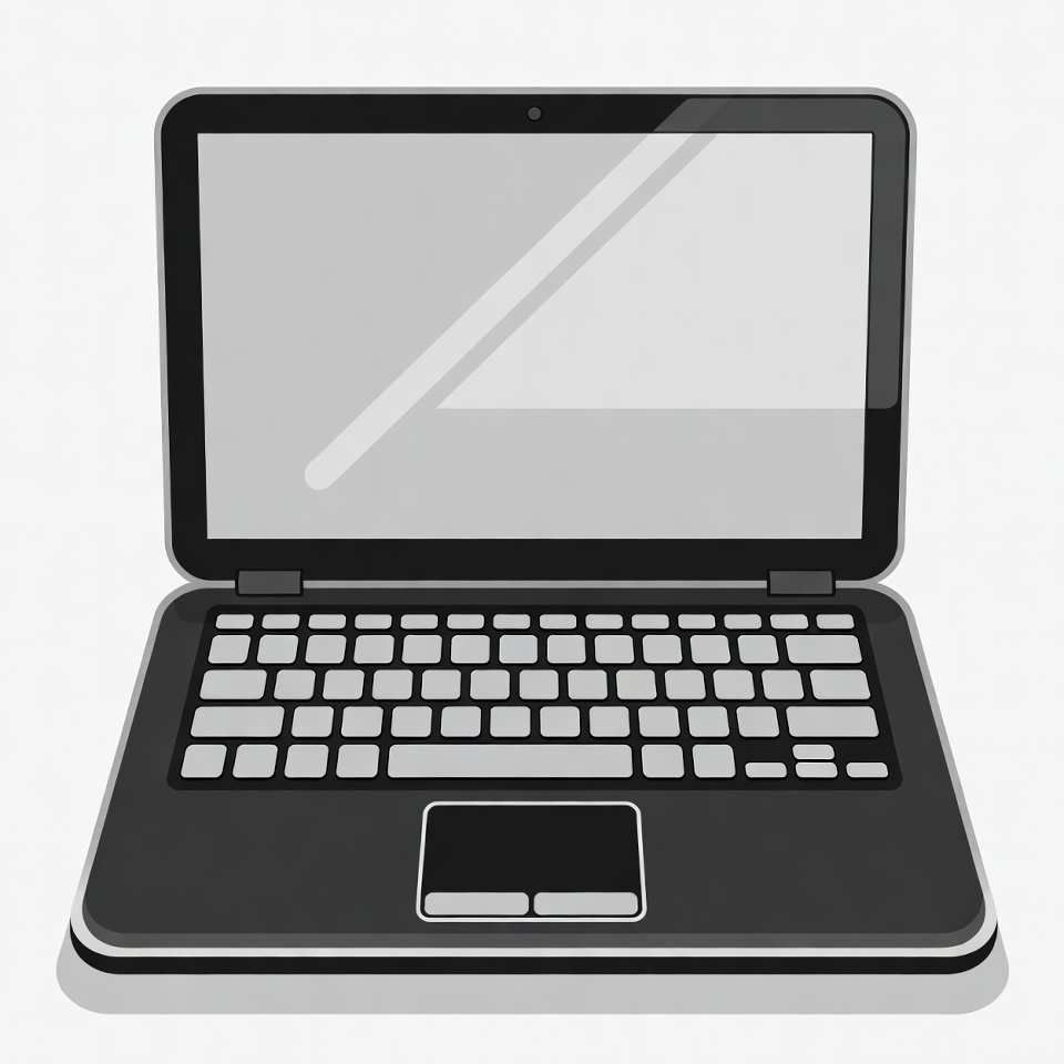 A simple vector illustration of a black laptop computer with the screen open. The screen is blank and reflective, while the keyboard features white keys on a dark base. It is depicted on a transparent background.
