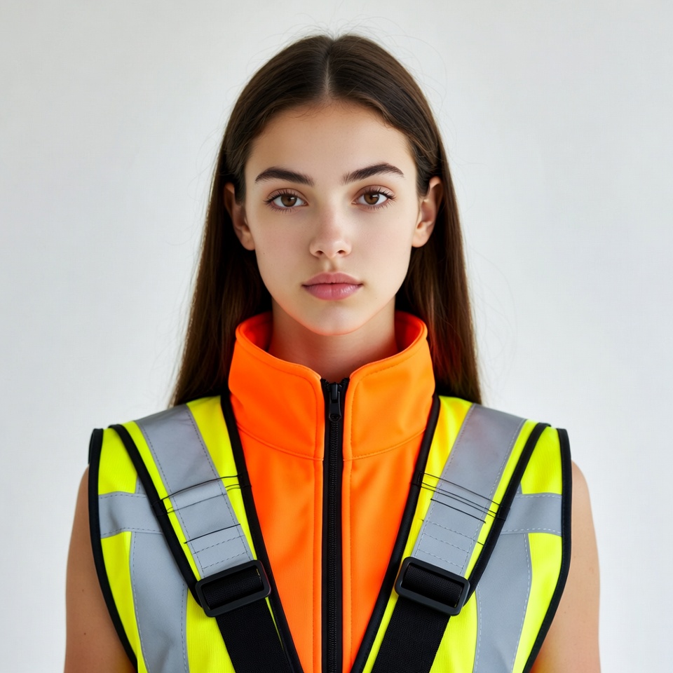 A young woman with long straight brown hair stands against a plain white background. She wears a bright yellow high-visibility safety vest with reflective silver stripes and an orange zipped collar. Her expression is neutral with subtle makeup.