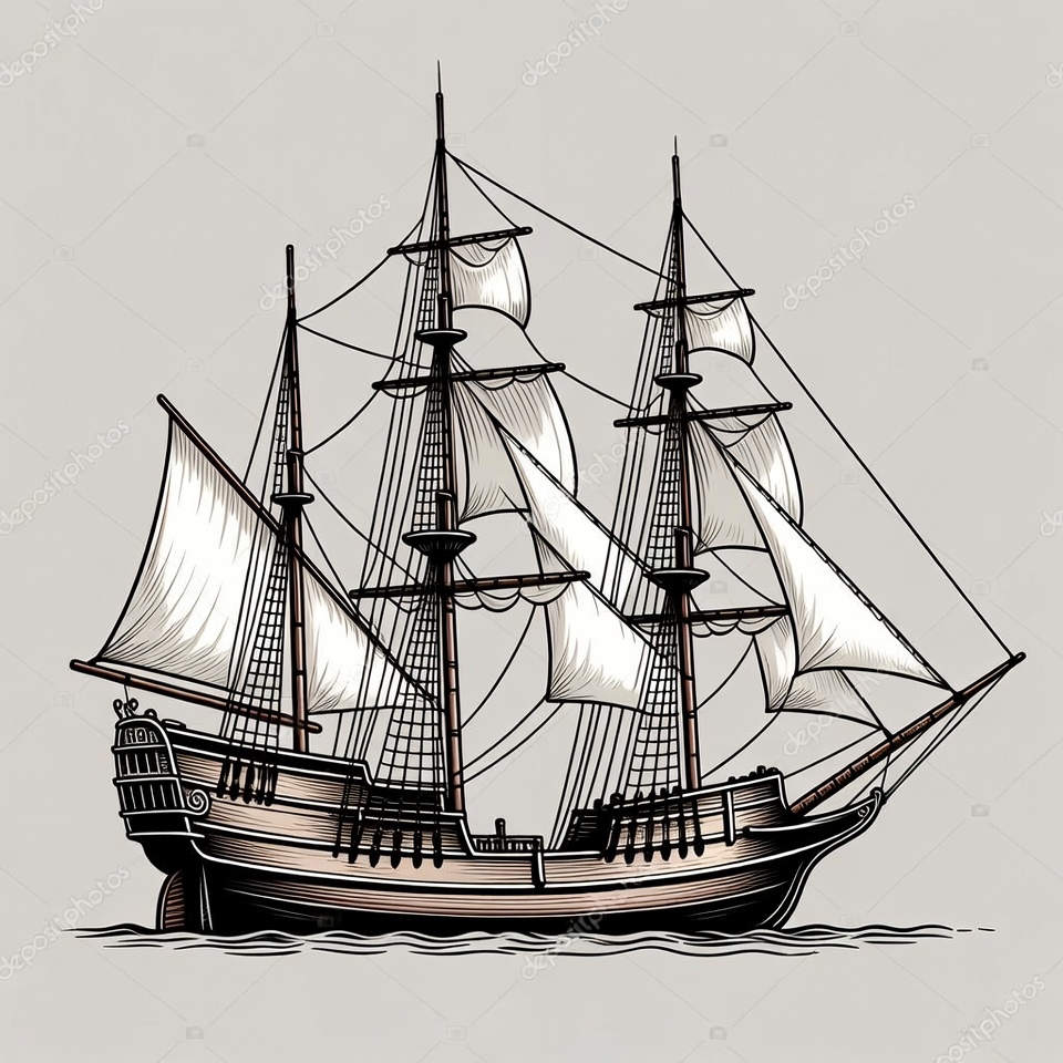 boat, clipart, full sails, illustration, isolated background, line art, maritime, nautical, ocean, pirate ship, rigging, sea, ship, tall ship, three masted, vessel, vintage ship, waves, white sails, wooden hull, sailing ship