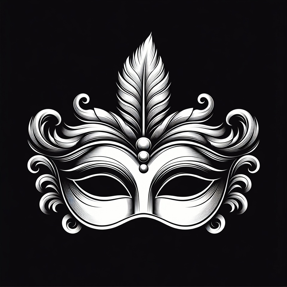 black background, carnival mask, clipart, decorative mask, elegant design, eye mask, fancy mask, feather mask, feathered mask, illustration, isolated, line art, masquerade ball, ornate mask, swirling patterns, vector art, venetian mask, vintage mask, white ink, masquerade mask