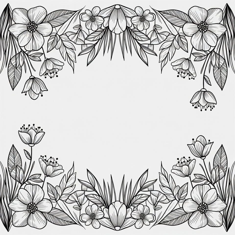 black white, blank center, botanical art, bouquet, clipart, decorative border, doodle, empty frame, floral design, flower border, illustration, isolated background, leaves, line art, nature illustration, ornament, pattern, petal details, sketch, stems, symmetrical flowers, vine elements, white space, wreath, floral frame