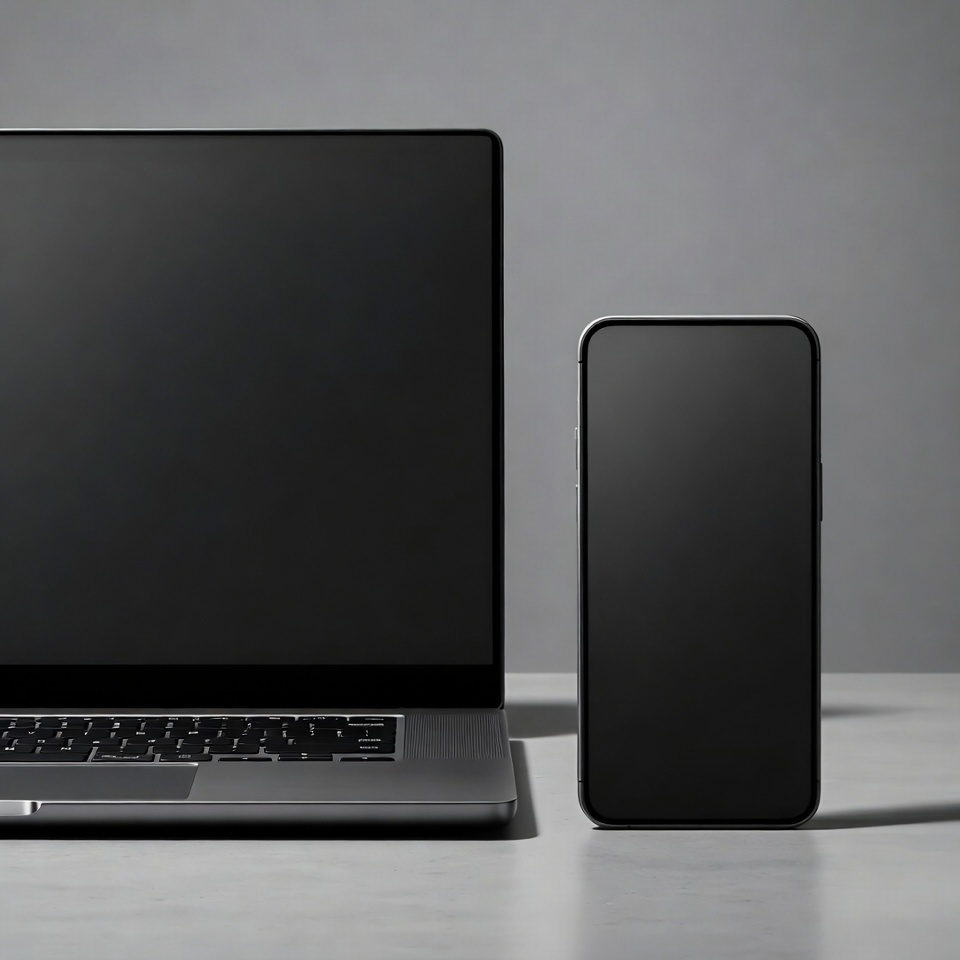 A silver laptop with a black screen stands on a white table next to a black smartphone with a blank screen. Both devices are positioned side by side against a gray background. The laptop keyboard and trackpad are visible.