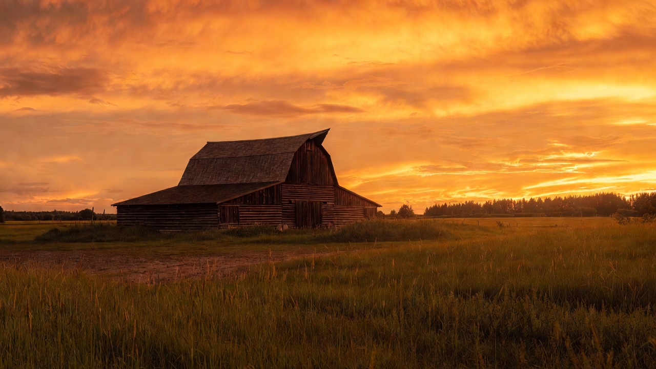 A weathered wooden barn with a gambrel roof stands in a golden field of tall grass. The scene is bathed in the warm orange glow of a dramatic sunset sky with scattered clouds. Surrounding fields extend into the distance under the vibrant evening light.