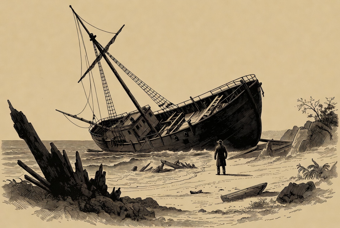 A vintage black and white illustration depicts a tall-masted sailing ship wrecked and tilted on a rocky beach near the sea. A man in a long coat and hat stands nearby on the sandy shore amidst driftwood and rocks. Sparse vegetation and waves are visible in the background.