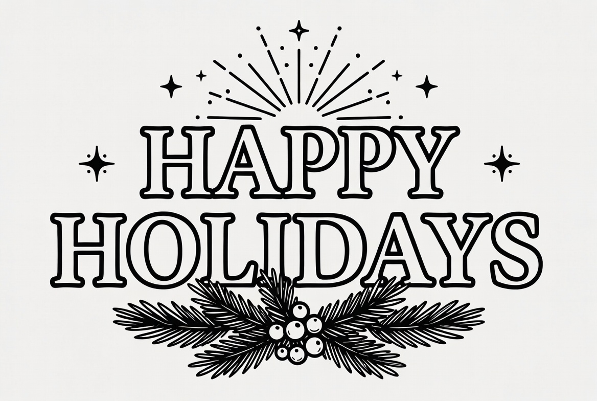 A black line art illustration features the bold text 'HAPPY HOLIDAYS' centered on a white background. Radiating starburst patterns surround the text above, while intricate holly leaves and berries decorate below. The design is simple, elegant, and suitable for holiday greetings.